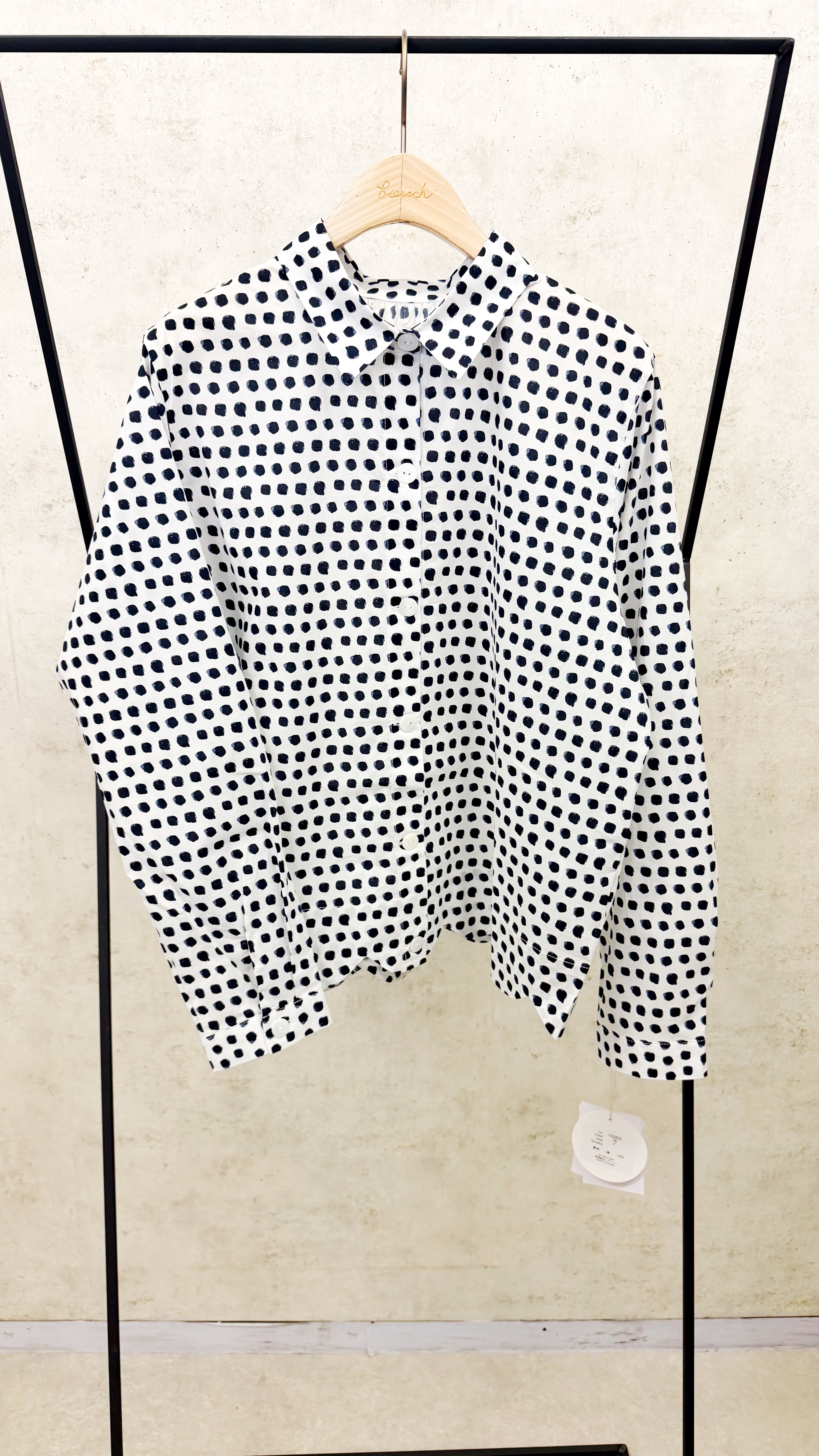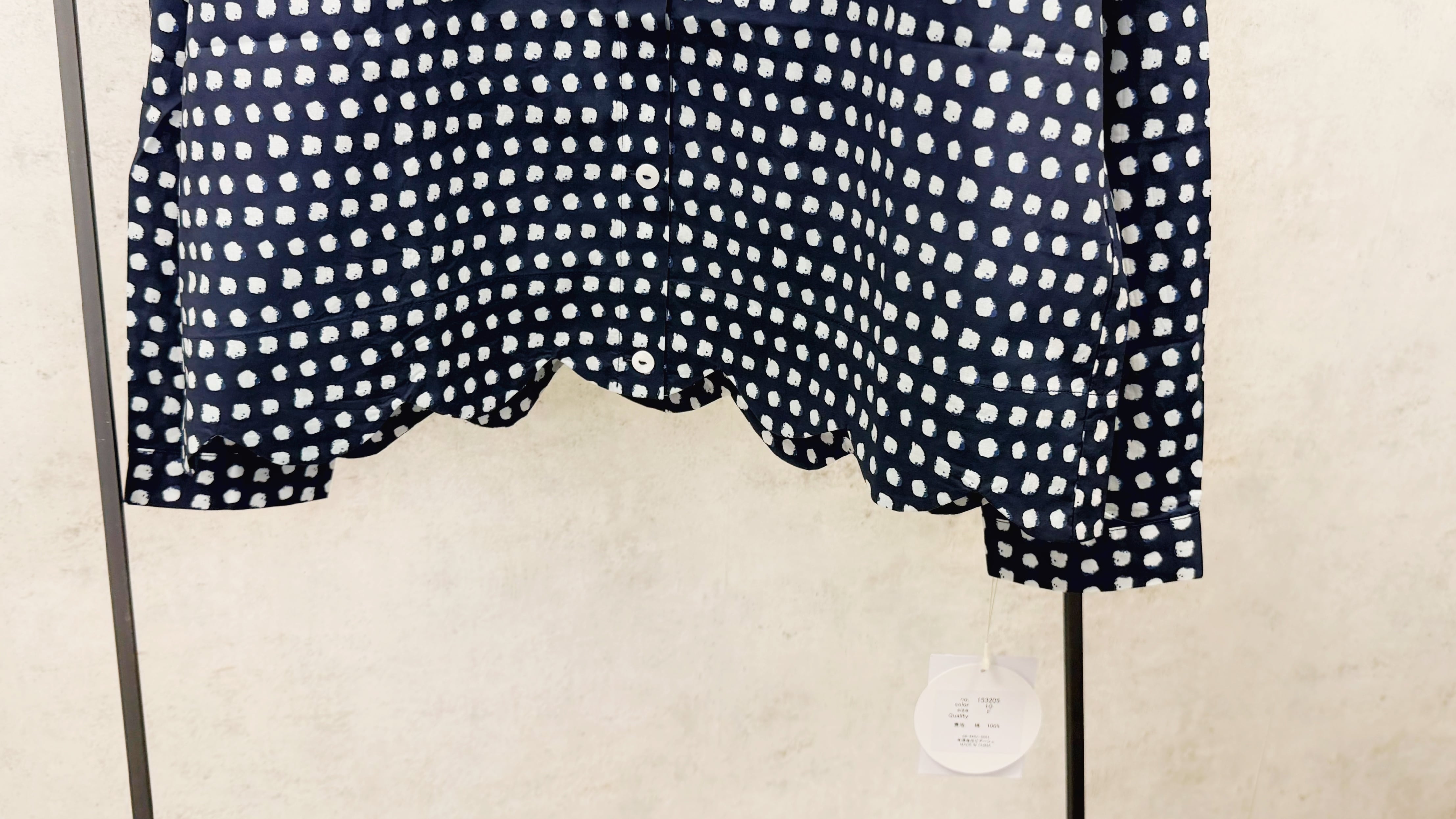 四角いドット柄と裾スカラップデザインが特徴的なシャツです。